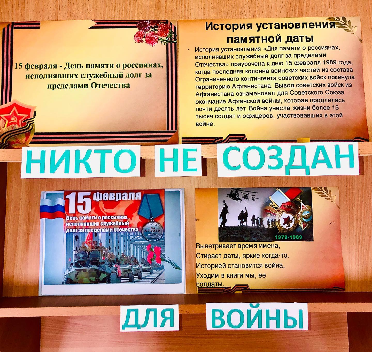 Выставка, посвящёна Дню памяти о россиянах, исполнявших служебный долг за пределами Отечества. Тема: "Никто не создан для войны".
