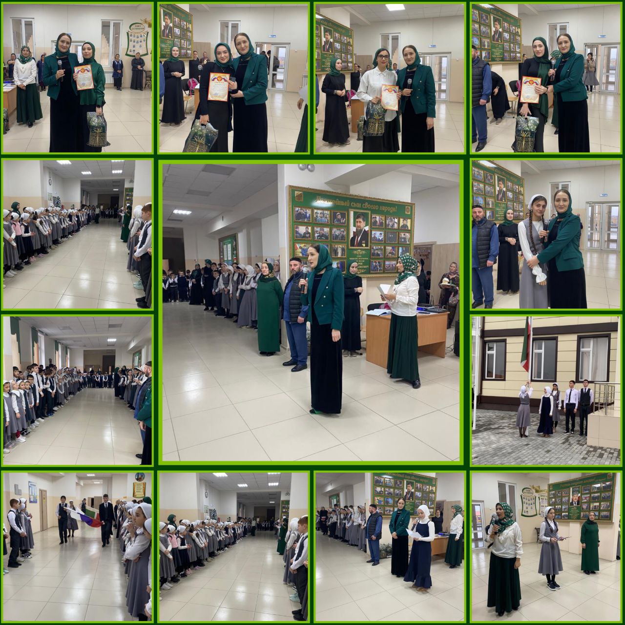 После того, как знаменная группа вынесла и установила государственные флаги РФ и ЧР началась информационная часть на которой директор Исраилова Р.Х. наградила грамотами и памятными подарками учителей , которые участвовали в конкурсе чтецов на чеченском языке.