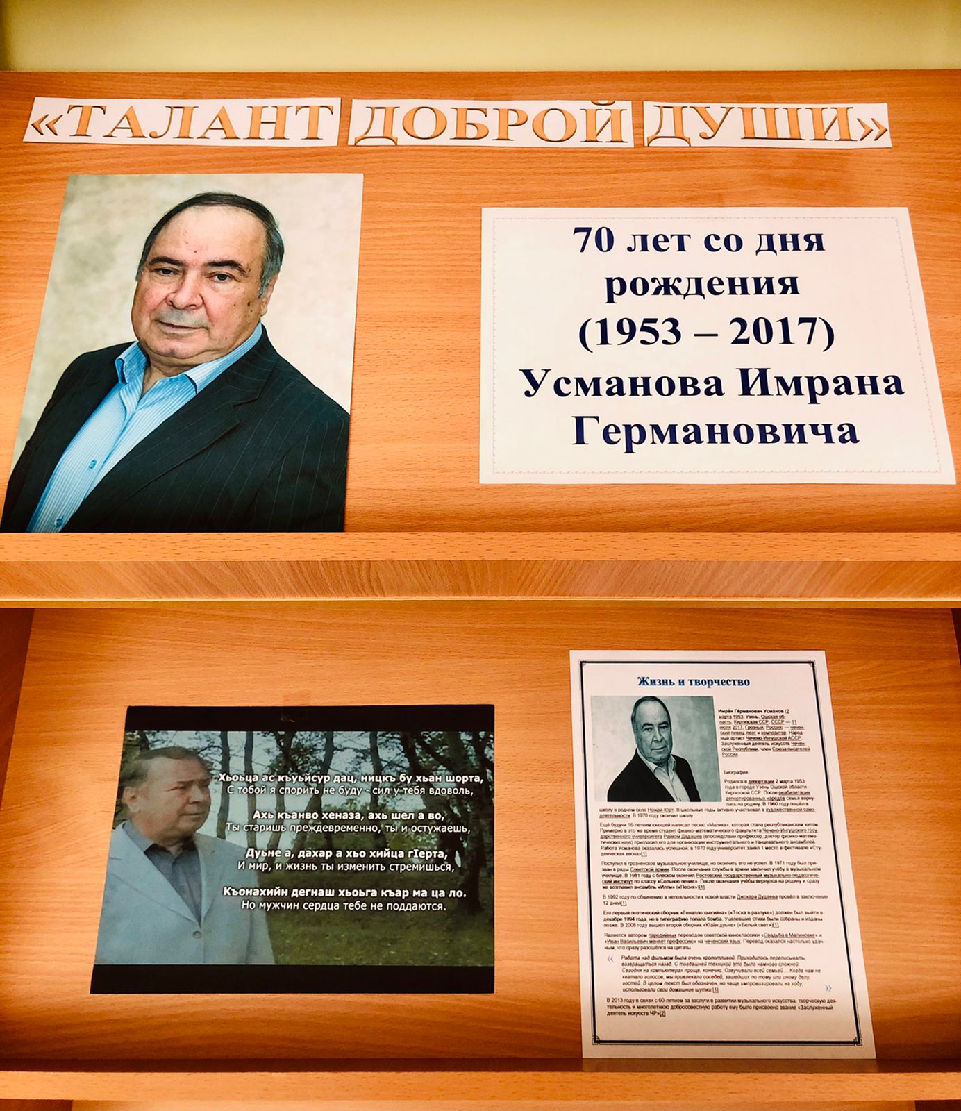 В МБОУ «СОШ №2 с.п. Знаменское» была организована выставка «Талант доброй души», посвящённая 70-летию со дня рождения Усманова Имрана Германовича.