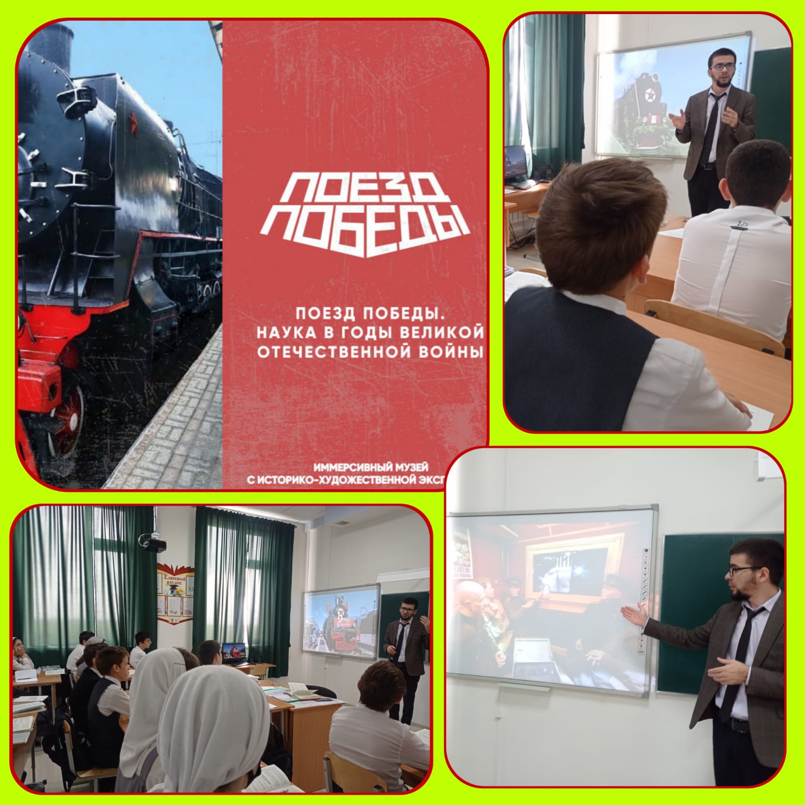 Аслан Шерипович продемонстрировал виртуальный тур «Поезд Победы», объясняя детям , что Победу приближали и на фронте, отстаивая каждую пядь родной земли, и в тылу — на заводах, в научных лабораториях и исследовательских институтах. Во время войны советские ученые ни на секунду не прекращали своих исследований. Водородное топливо, космонавтика, атомная энергетика, реактивные двигатели — всё это появилось уже в мирное время. Наши ученые помогли решить огромное число чрезвычайно трудных задач, необходимых фронту, и тем самым не только приблизили Победу, но и укрепили статус нашей страны как научной державы на многие десятилетия вперед...»