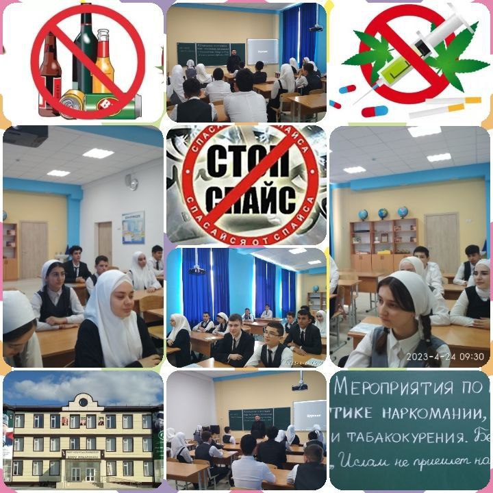 24.04.2023Мероприятия по профилактике наркомании, алкоголизма и табакокурения в молодёжной среде. Показ видеоматериала "Алкоголь. Курение. Наркотики", "Стоп-Спайс" и беседа в 9 "А" классе на тему: "Ислам не приемлет наркотики и психоактивные вещества".